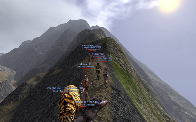 Unter der (Berg-)Führung von Varielth (Sangu) trafen sich alle abenteuerdurstigen Bergsteiger, um die Nebenpfade Funcoms auszukundschaften und sich ein Bild von oben zu machen, über die geheimnisvolle Bergwelt Hyboriens, mit dem einmaligen Blick auf ihr Startgebiet Hellsand.