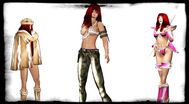 Das Pelzmäntelchen für kalte Tage, dann ein ziemlich gewagtes Gang Outfit und schliesslich mein Fantasy Armor Bikini.